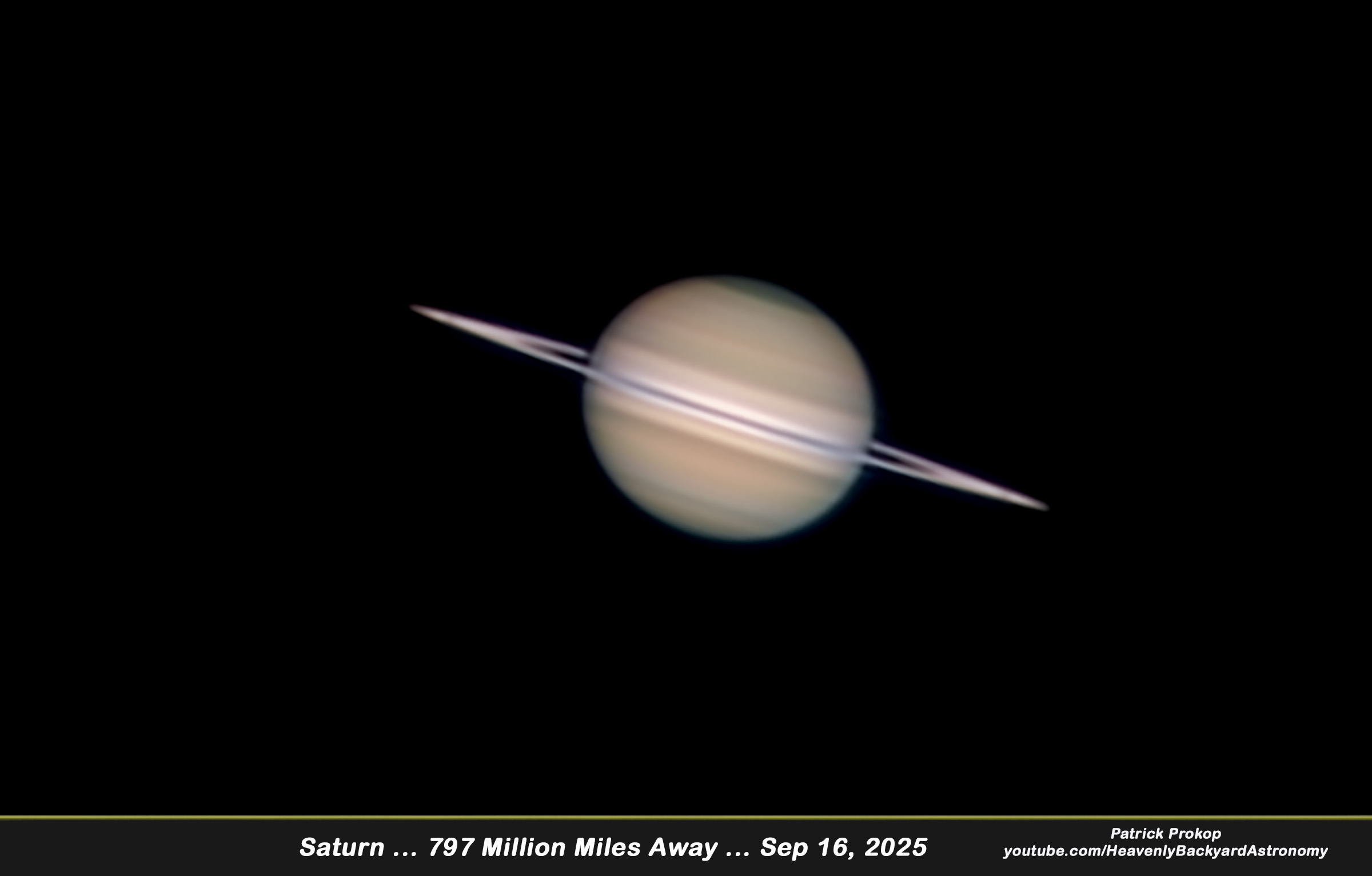 I took this image of Saturn at late night of September 16, 2025 using the Celestron 11" EdgeHD telescope with a focal length of 2,800mm. The camera was the ZWO 585 planetary camera with a pixel size of 2.9 microns. Saturn was a week away from opposition and was about 797 million miles away.