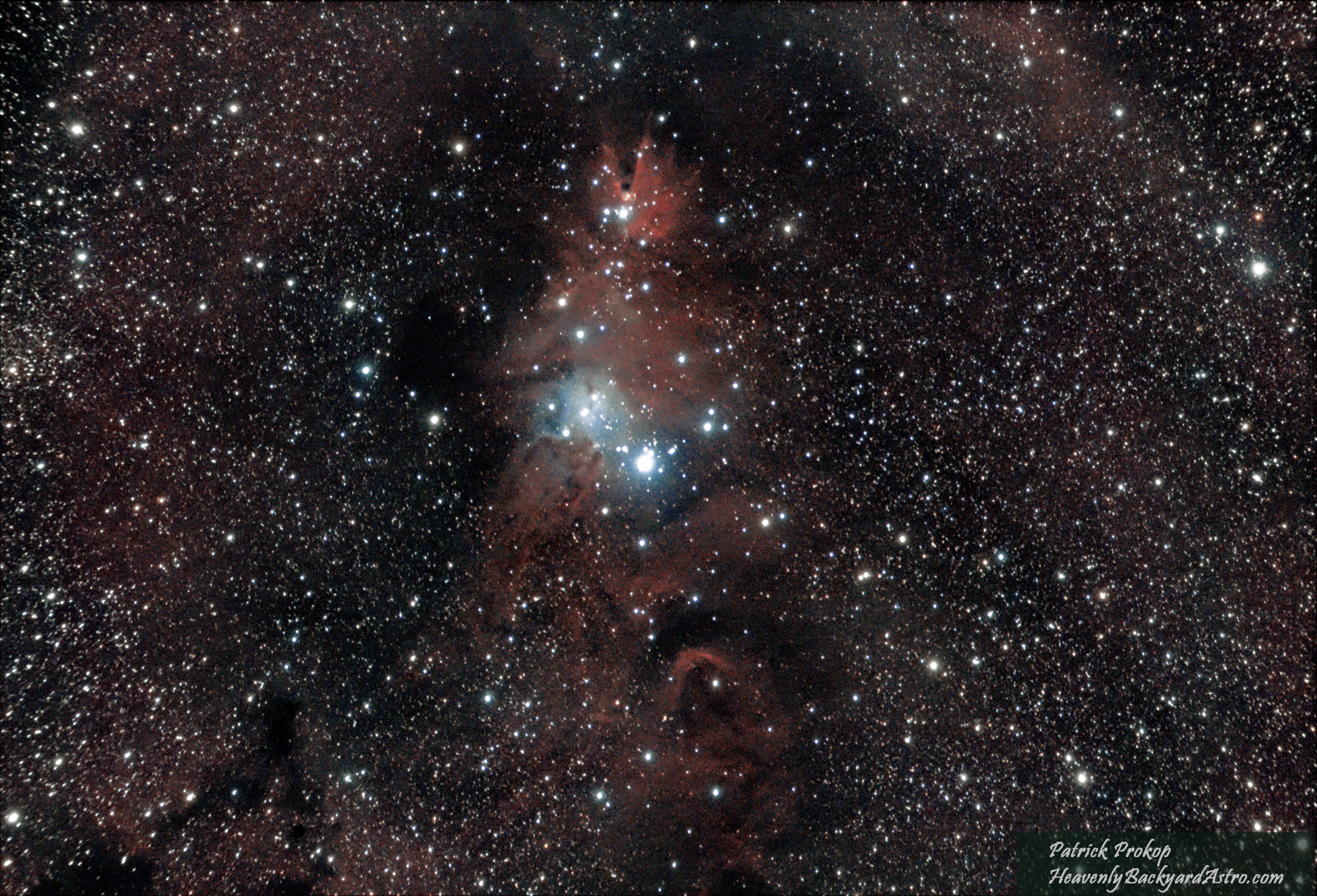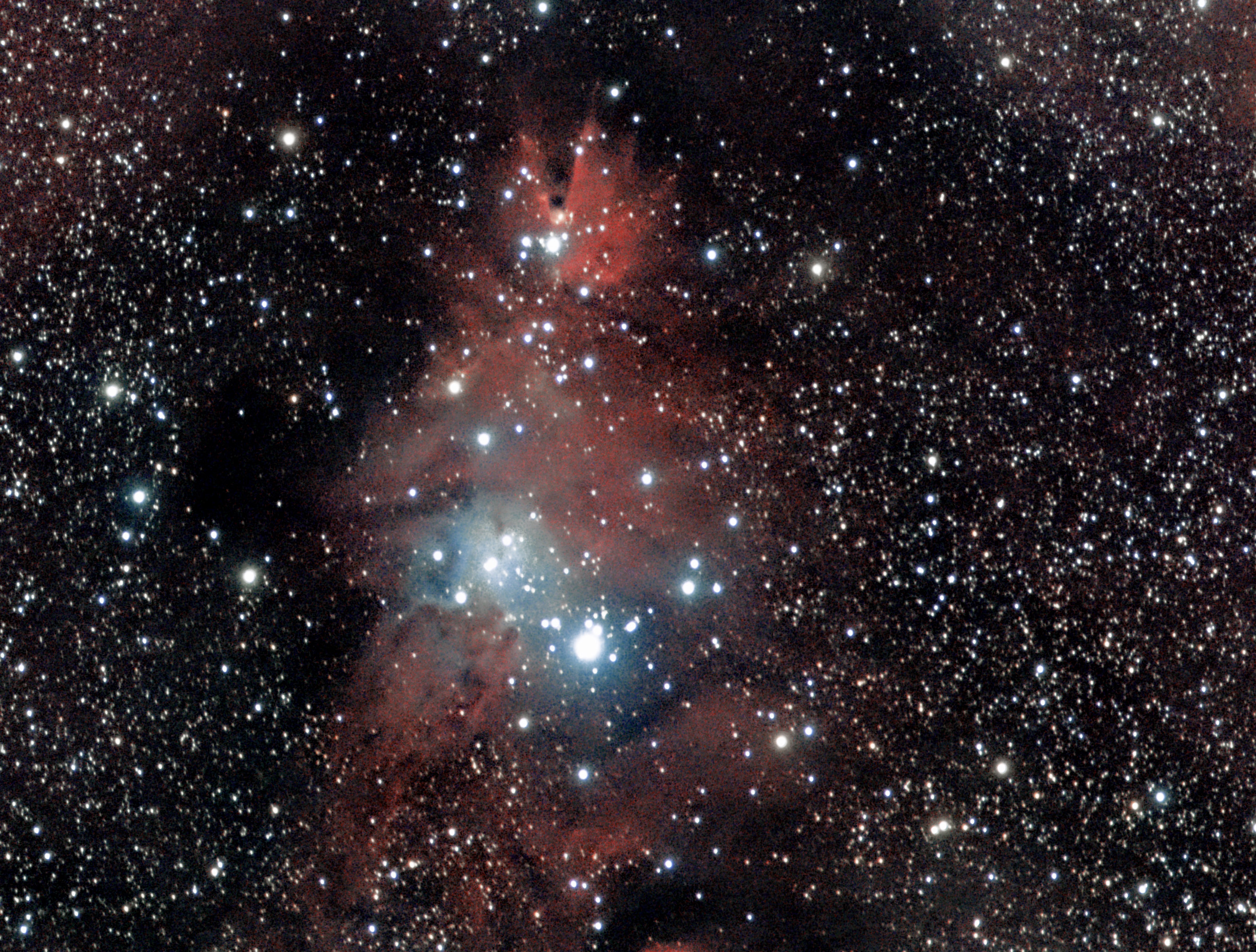 This 'festive' nebula is high in the NE around midnight in early December and not visible to the naked eye. However, with time-lapse photography, brilliant colors appear among the vast region of stars in the Milky Way. The feature that forms the so-called Christmas tree is actually compose of four different nebulae; the 'Snowflake', 'Cone', 'Fox Fur', and 'Christmas Tree'. These dust clouds, along with hydrogen and helium are producing luminous new stars. The distance is roughly 2,600 light-years from us.