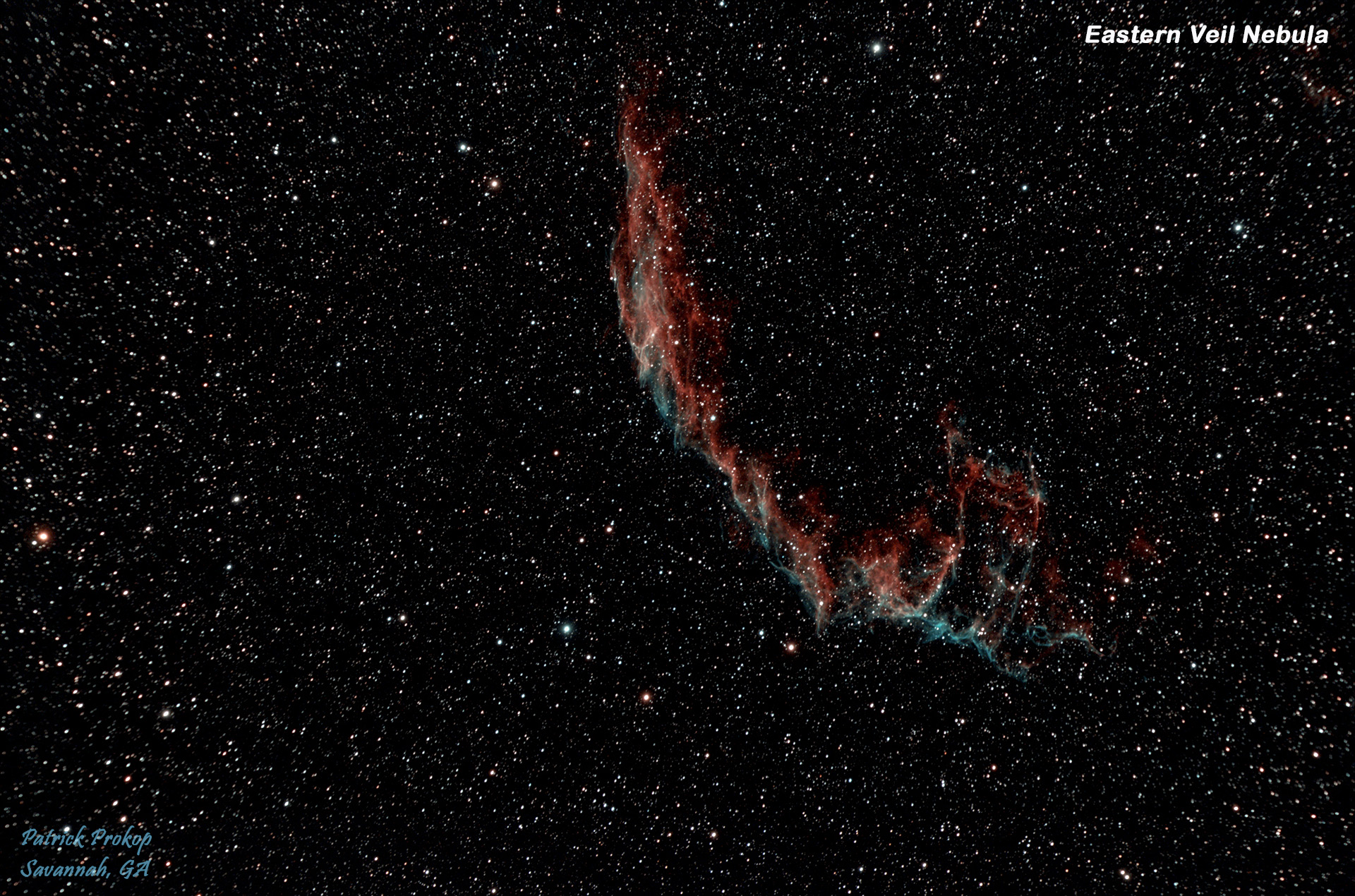 This nebula is a cloud of heated and ionized gas and dust. It is the remnant filament of a supernova explosion that occurred about 8,000 years ago, perhaps from a star about 20 times more massive than our sun. It is about 1,470 light-years away. This is part of the 'Cygnus loop' in the constellation Cygnus the Swann and is high overhead at 10 pm in early October (However, you can't see it without the aid of a telescope and time-lapse photography).