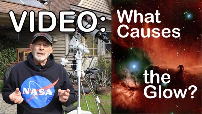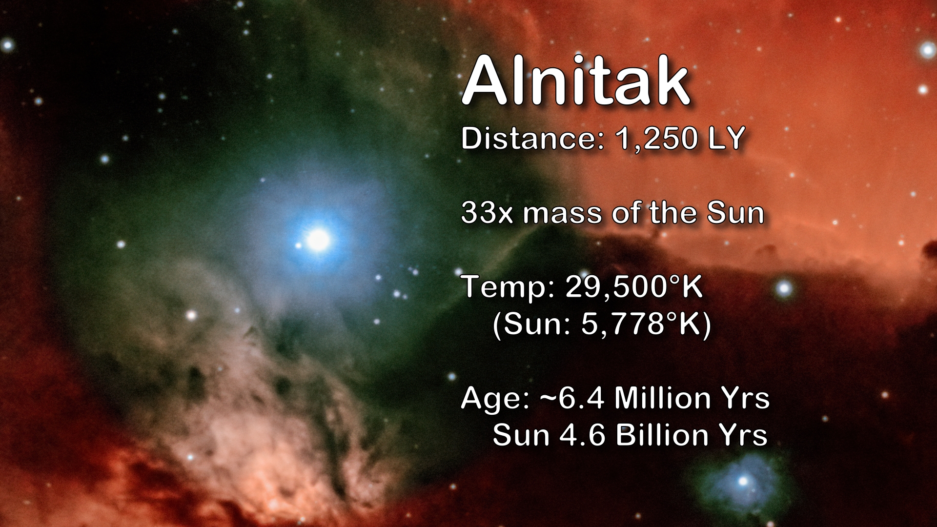 The nebulosity of this area is caused mostly by emission of red light from the radiation from nearby massive stars, particularly Alnitek (just above the 'Flame' and the double blue star Sigma Orionis (above and to the upper right of the horse's head. These two stars are extremely young and extremely hot ... 29,000-31,000°K as compared to our sun which is burning at a steady 5,775°K. These stars are only a few million year old, as compared to the age of the sun at 4.6 billion years.
