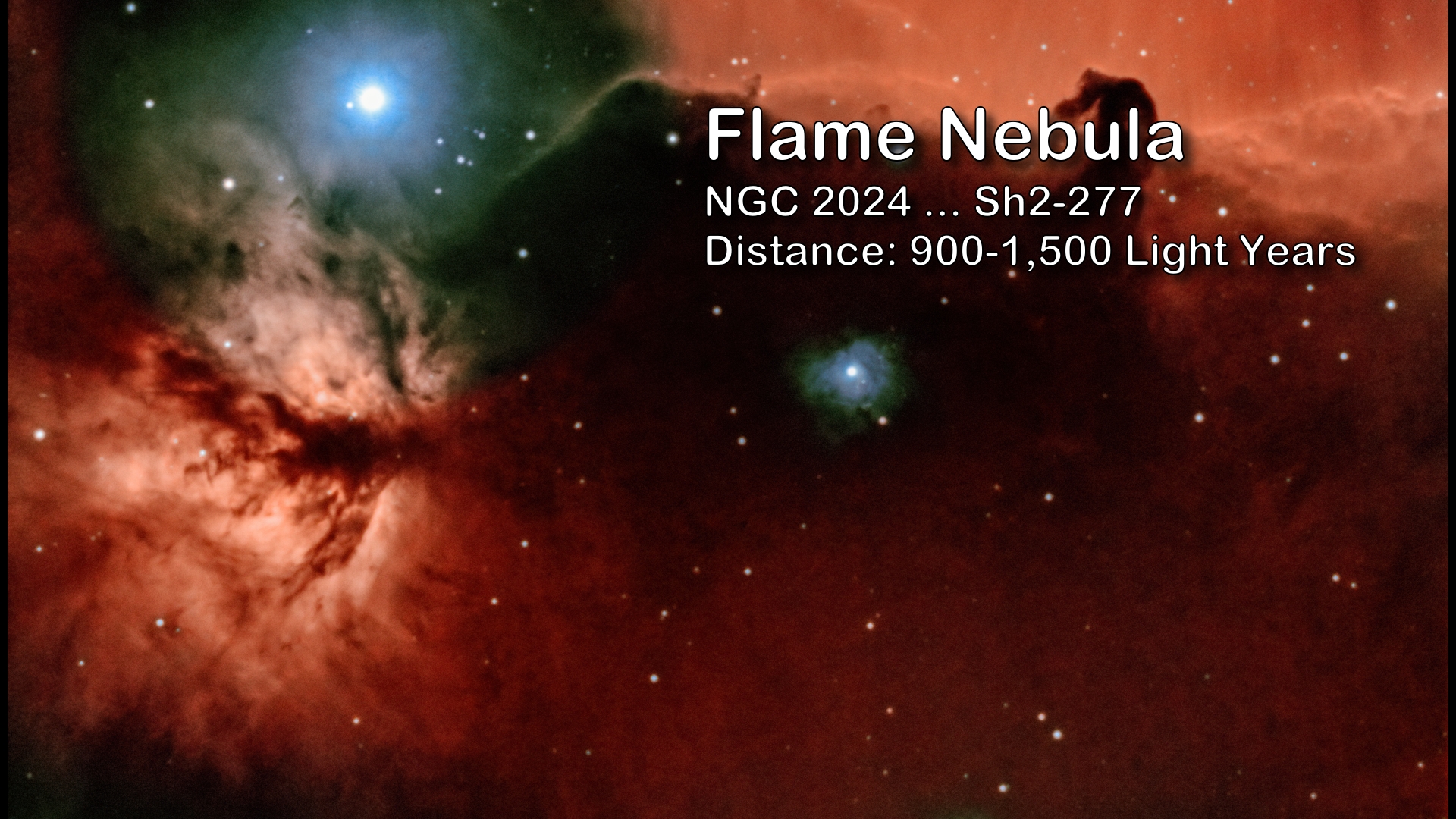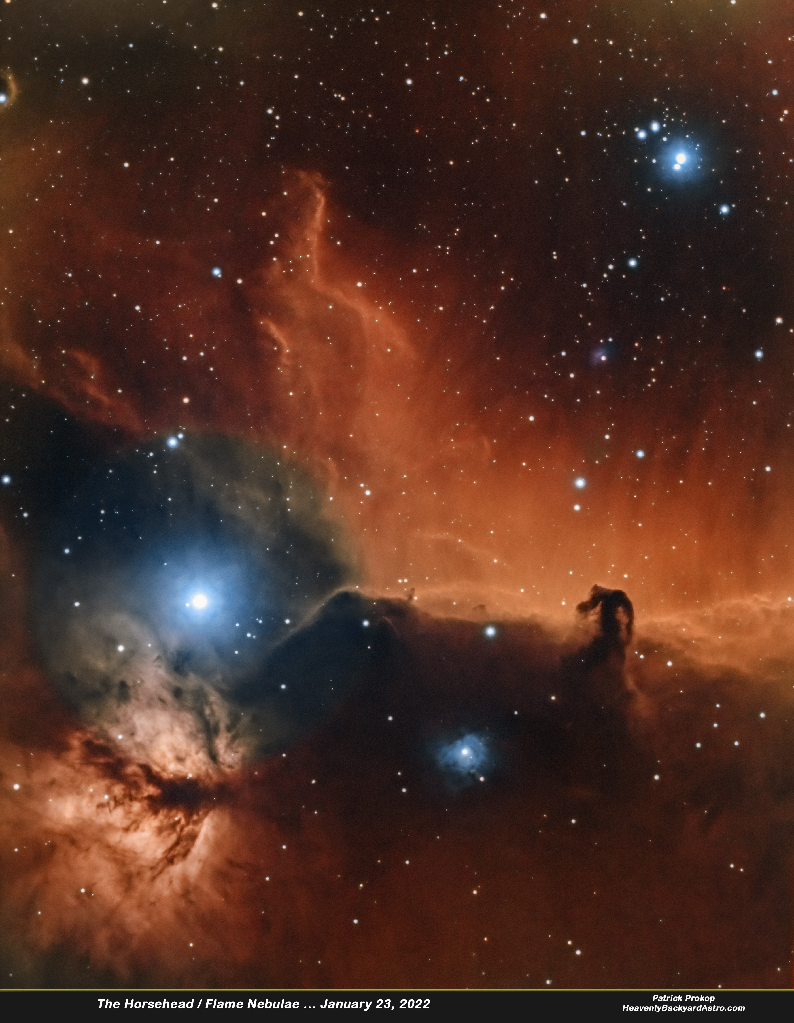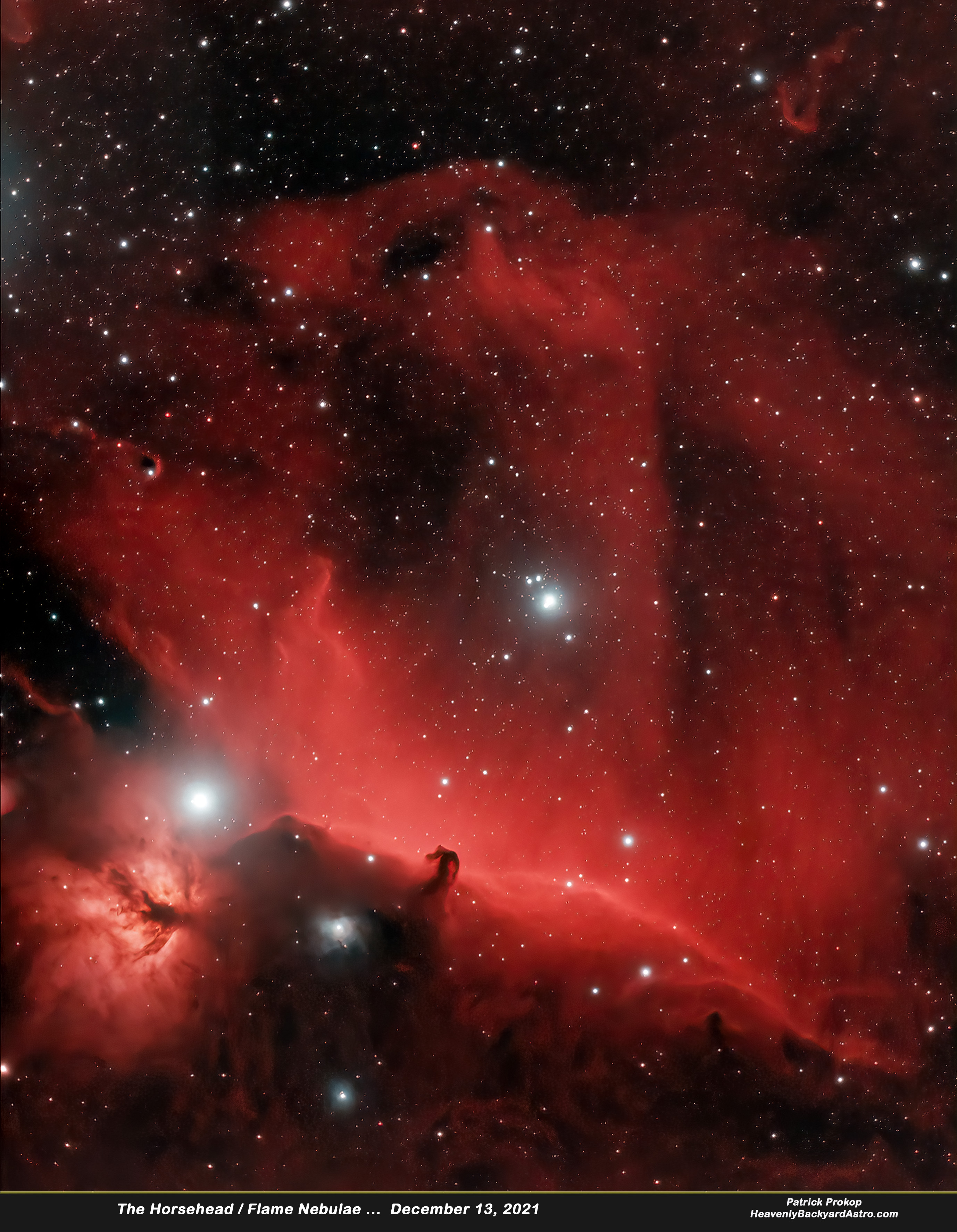 The 'Horsehead' / 'Flame' Nebula is about 1,375 light-years away and the horse's head is mainly a large cloud of interstellar dust obscuring the stars and nebulous gasses. The red color originates from hydrogen gas predominantly behind the nebula, ionized by the nearby bright star Sigma Orionis above the horse's head. There is an additional abundance of hydrogen dust throughout this region which glows in a red color caused by the radiation of nearby stars.