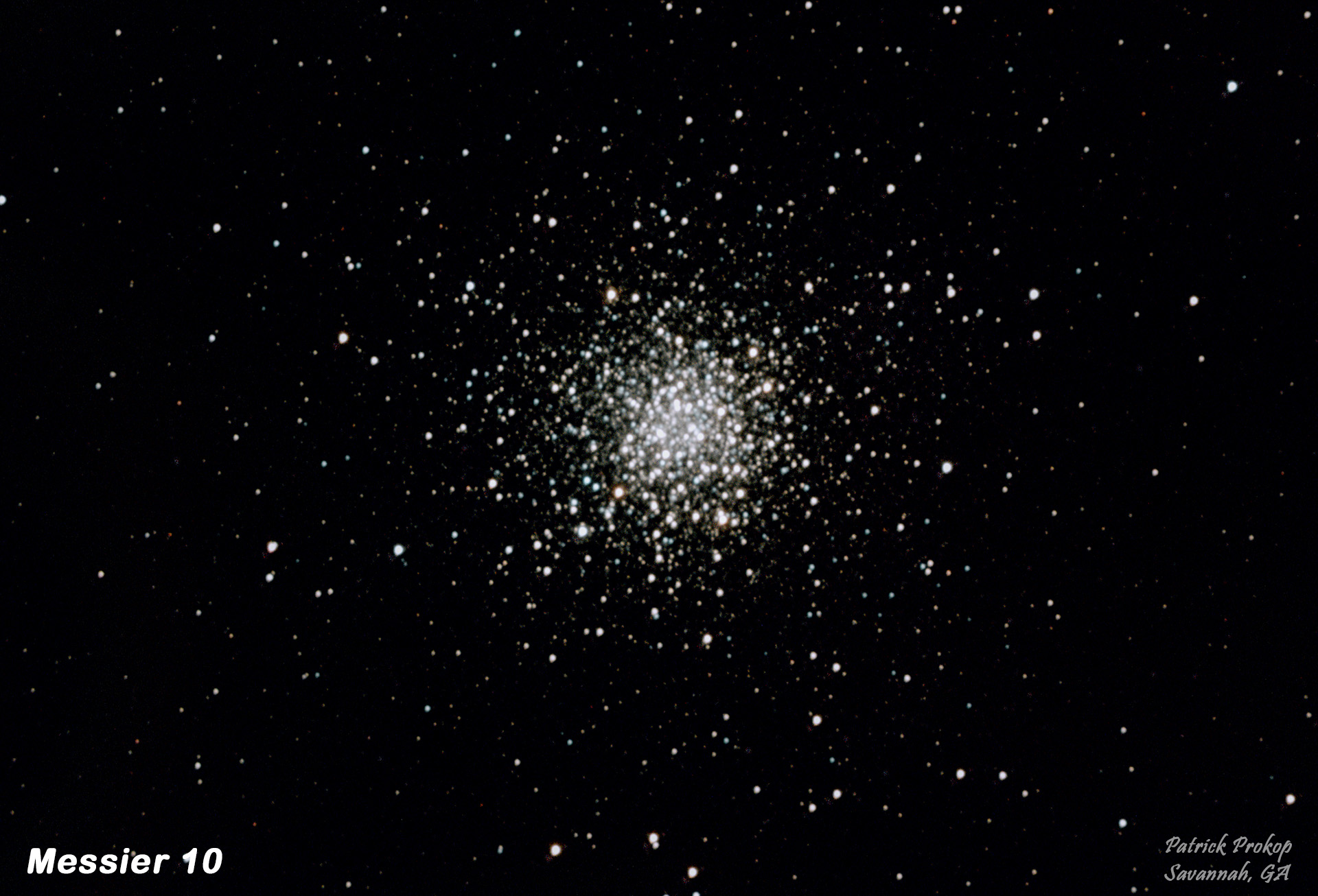 Messier 10 (New General Catalog 6254) is a fine globular cluster that's located in the constellation of Ophiuchus which is high in the southern sky around 10 pm in late July. M10 is 14,300 light-years distant from earth and about 16,000 light-years from the galactic center (Earth is about 25,000 ly from the center). It is estimated to be 11.4 billion years old with mostly 1st and 2nd generation (gold, red, and white color) stars, as compared to our sun which is a 3rd generation star being relatively young at 4.3 billion years old. However, the blue color stars are younger being about 2-5 billion years old. It's estimated M10 contains 100,000 stars. The entire system is contained within our Milky Way Galaxy.