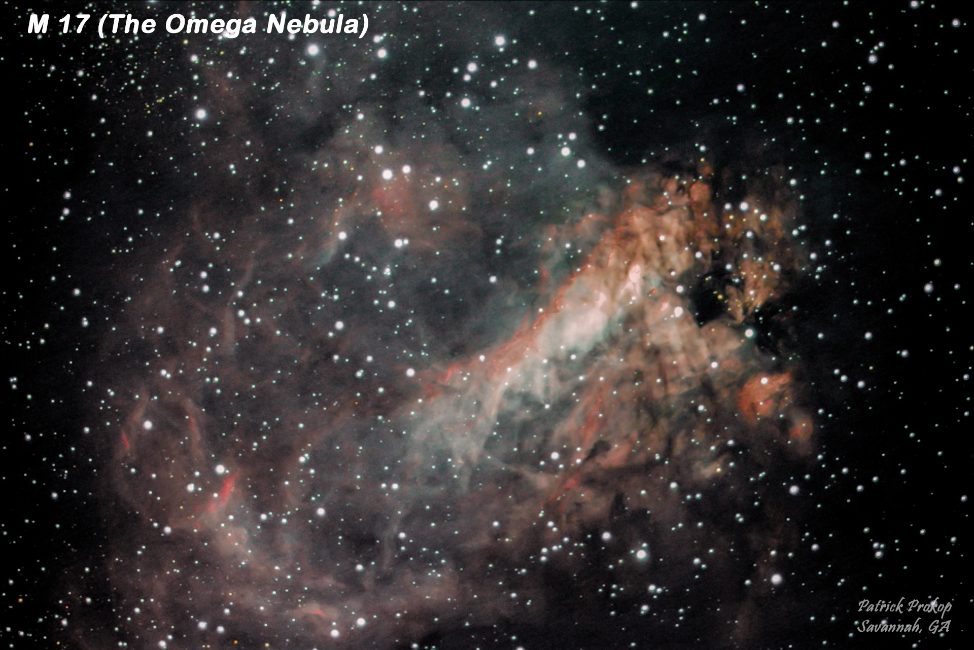 The Omega Nebula is a famous star-forming emission nebula and is between 5,000 and 6,000 light-years from Earth. It is located in the rich starfields of the Sagittarius area of the Milky Way. It is also known as the Swan Nebula, Lobster Nebula, Horseshoe Nebula and Checkmark Nebula. Embedded within it is an open cluster of at least 35 stars that provides the source of the glowing gas. All-in-all, there are hundreds of stars within the nebula which spans an area of 32 light-years across. This object is best viewed during the months of June, July and August medium high in the south at midnight.