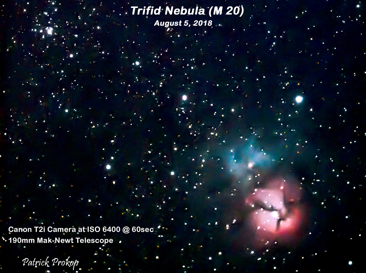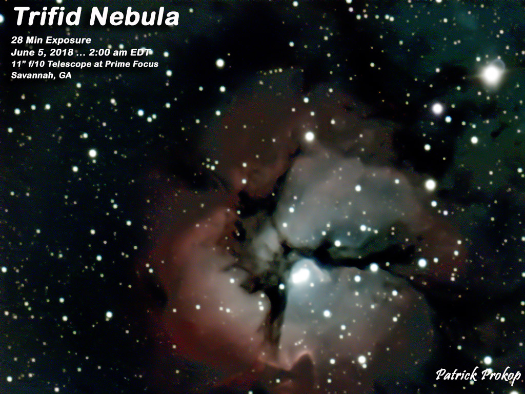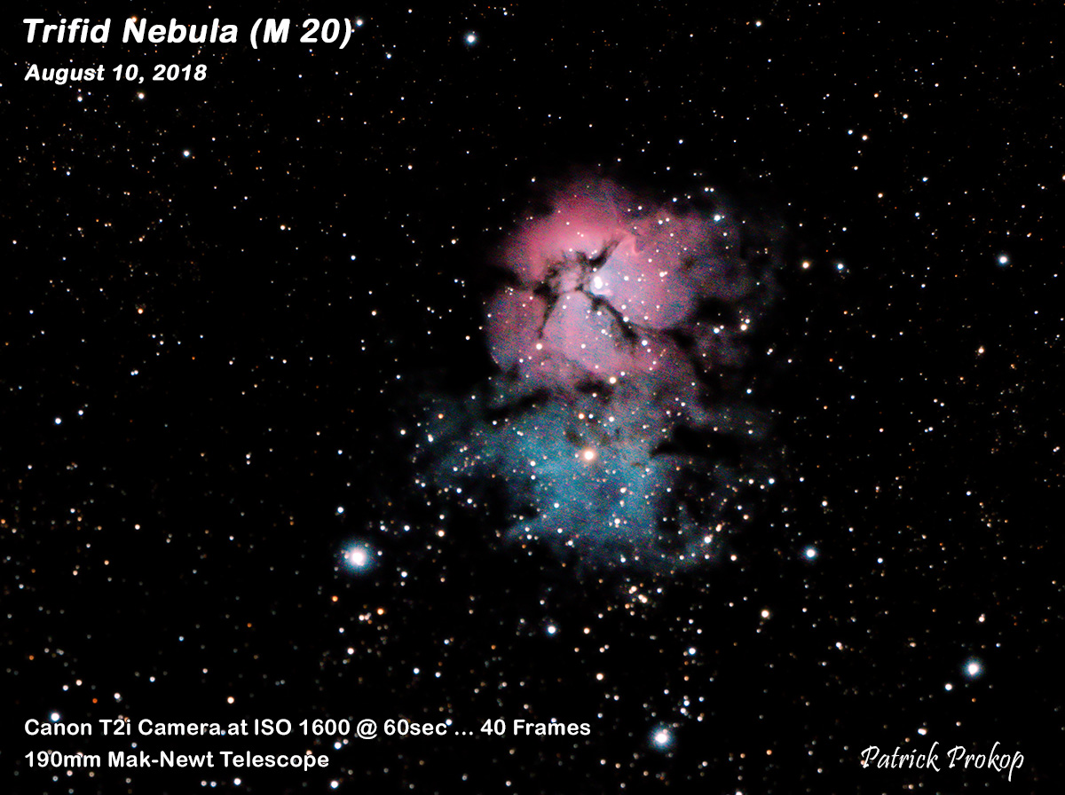 The Trifid Nebula (Also Known As Messier 20 and NGC 6514) is one of the most beautiful deep space objects in the summer sky. I took this 3hr 30mn image early in the morning of May 6 & 7. Trifid is Latin for "split into three parts" or "threefold" and you can clearly see the three parts in the red area. It is a gaseous bright colorful emission and reflection nebula with the emission nebula appearing red, the reflection nebula blue and numerous dark lanes mixed in between. It is about 5,200 light-years away and in the sky, it is in the constellation of Sagittarius. It is medium high in the south at midnight in July. Click on the picture for a larger view.