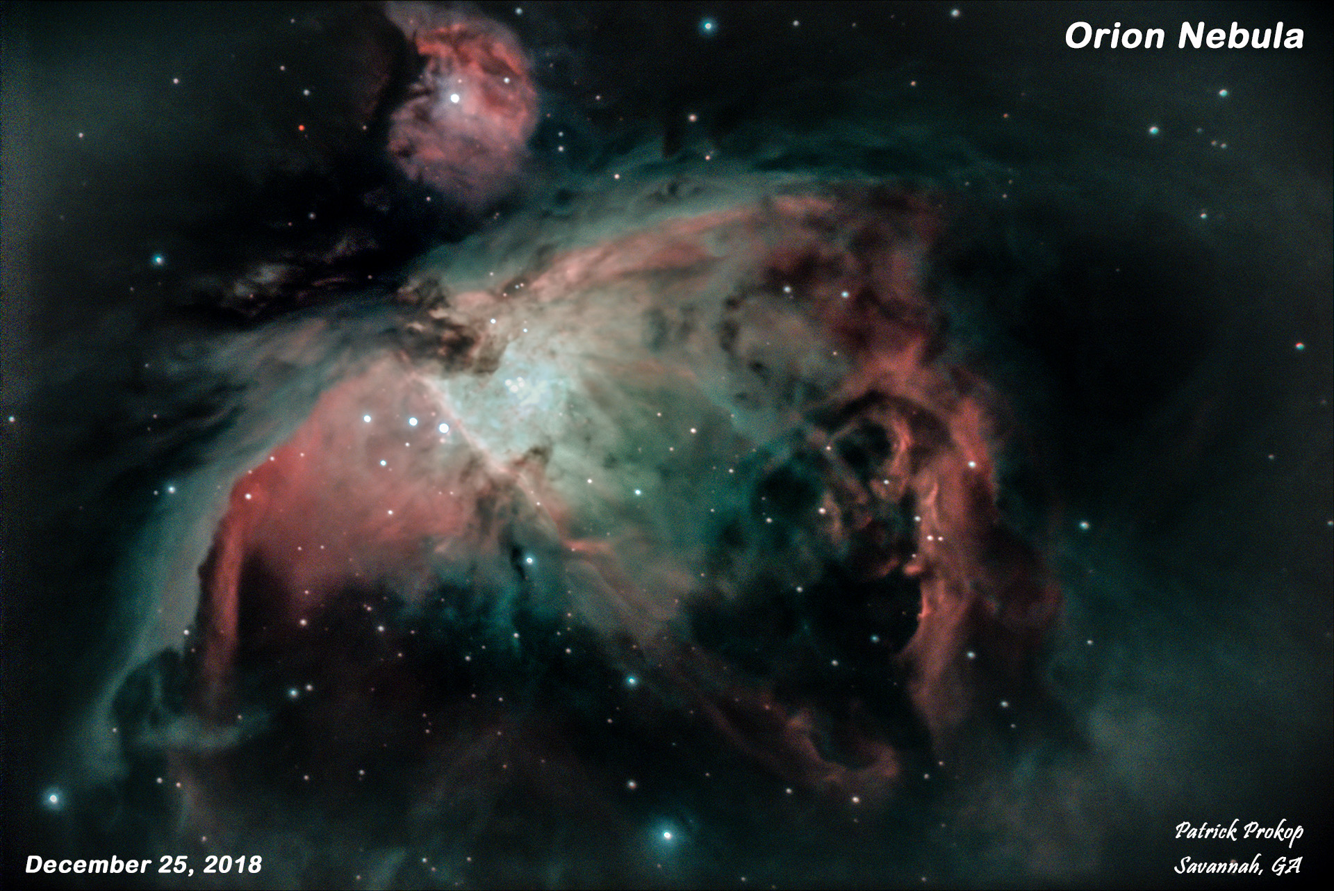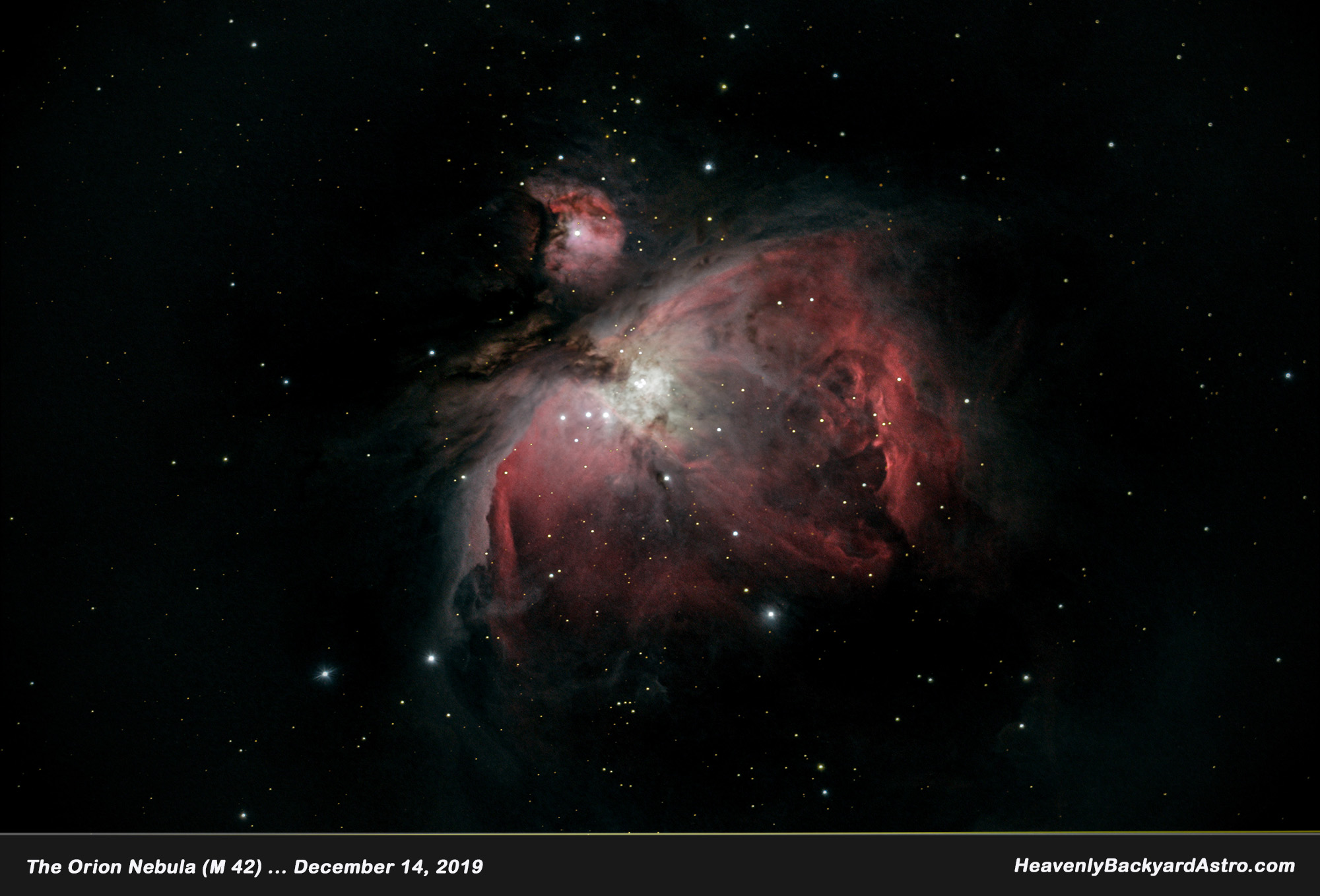 I took this image Saturday night, December 14, 2019, in my backyard. It was supposed to be just a test image for the Orion 190mm Maksutov-Newtonian Astrograph telescope and new Pegasus autofocus assembly, but wow, it came out great. You can also see the four bright young stars in the core of the nebula called 'The Trapezium".