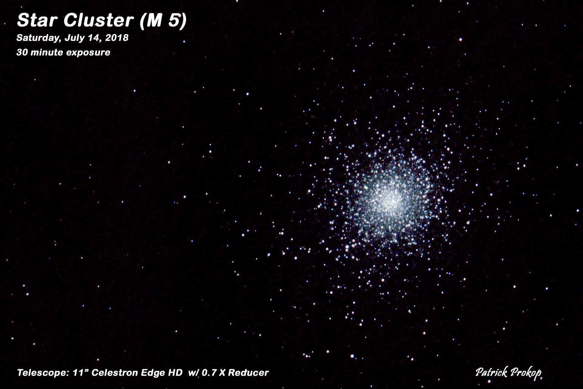 This cluster is estimated to be 13 billion years old. M5 is one of the oldest Milky Way globular clusters. It's estimated to contain at least 500,000 stars. This cluster is about 24,500 light-years away. M5 is high overhead at 11 pm in middle July. I took this picture Saturday night (July 14, 2018) under a partly cloudy sky.