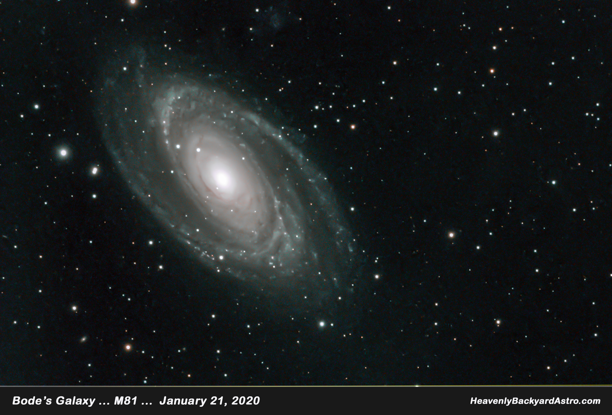 Messier 81 is also known as Bode's Galaxy, named after the German astronomer Johann Elert Bode who discovered it in 1774. It is about 12 million light-years away and about the same size of our Milky Way Galaxy with about 250 billion stars. It appears nearly face on. The center contains a super black hole.