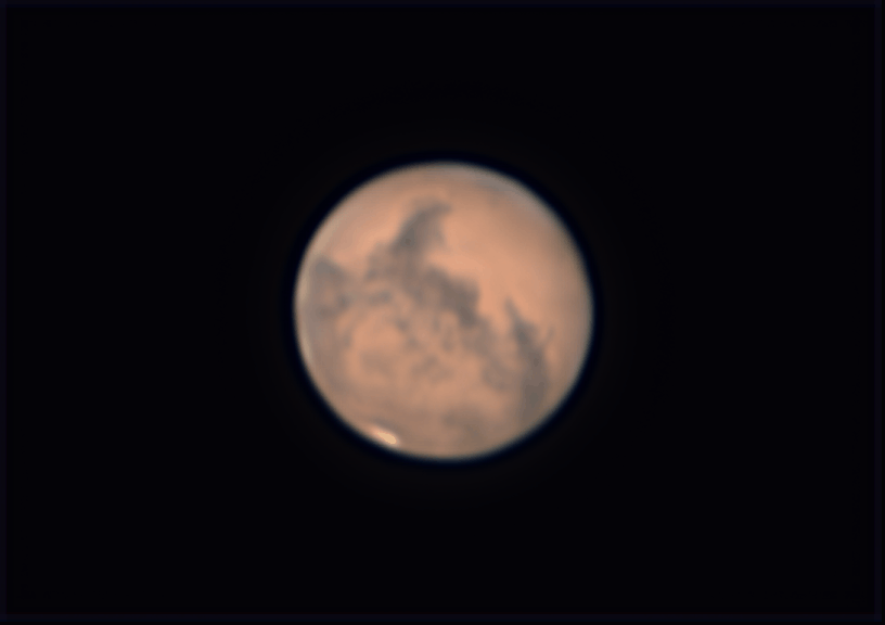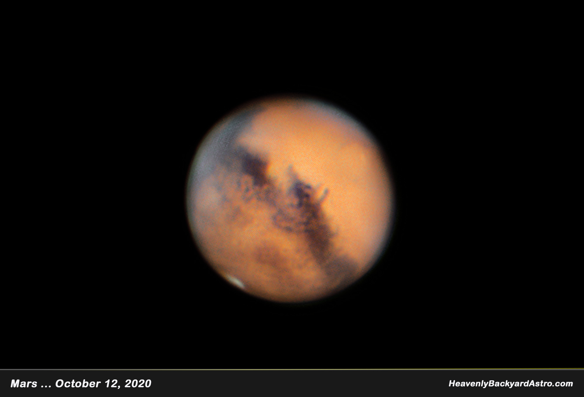 The Warrior planet with its angry ruddy red color. I took this image on the night of October 12, 2020 right around midnight. Mars had just past opposition and its closest approach to earth at a distance of 39.78 million miles. You can see one of the polar ice caps along with what could be long striated dust clouds.