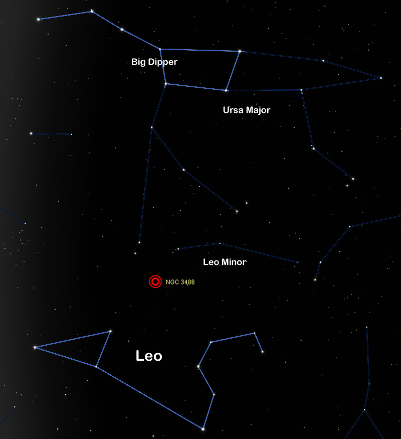 This galaxy is about 30 million light-years from Earth and is located in the sky between the bottom of the big dipper and Leo the Lion. It has a small bright core, perhaps containing a small black hole. The uniform spiral arms are rather dim. The brighter blue stars indicate new star births ongoing. Overall, this galaxy is quite dim and difficult to expose. This is a 2hr 5mn exposure.