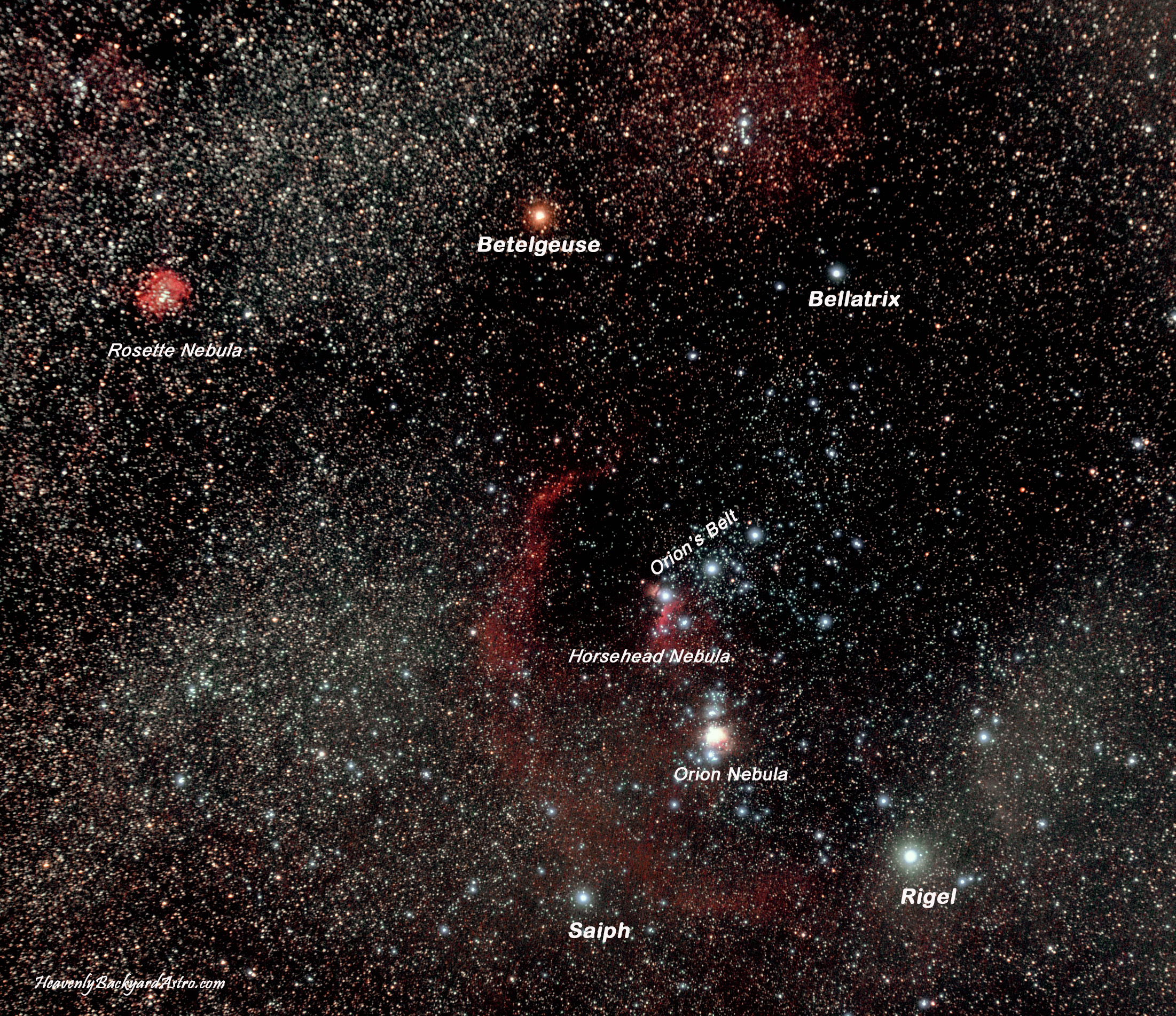 This is a super wide-field view of the constellation of 'Orion the Hunter'. As you can see, this area of the sky is rich in star population and is known as the 'Orion Arm' of the Milky Way galaxy. It is also rich is nebulosity containing the famed Orion, Horsehead, and Rosette nebulae.