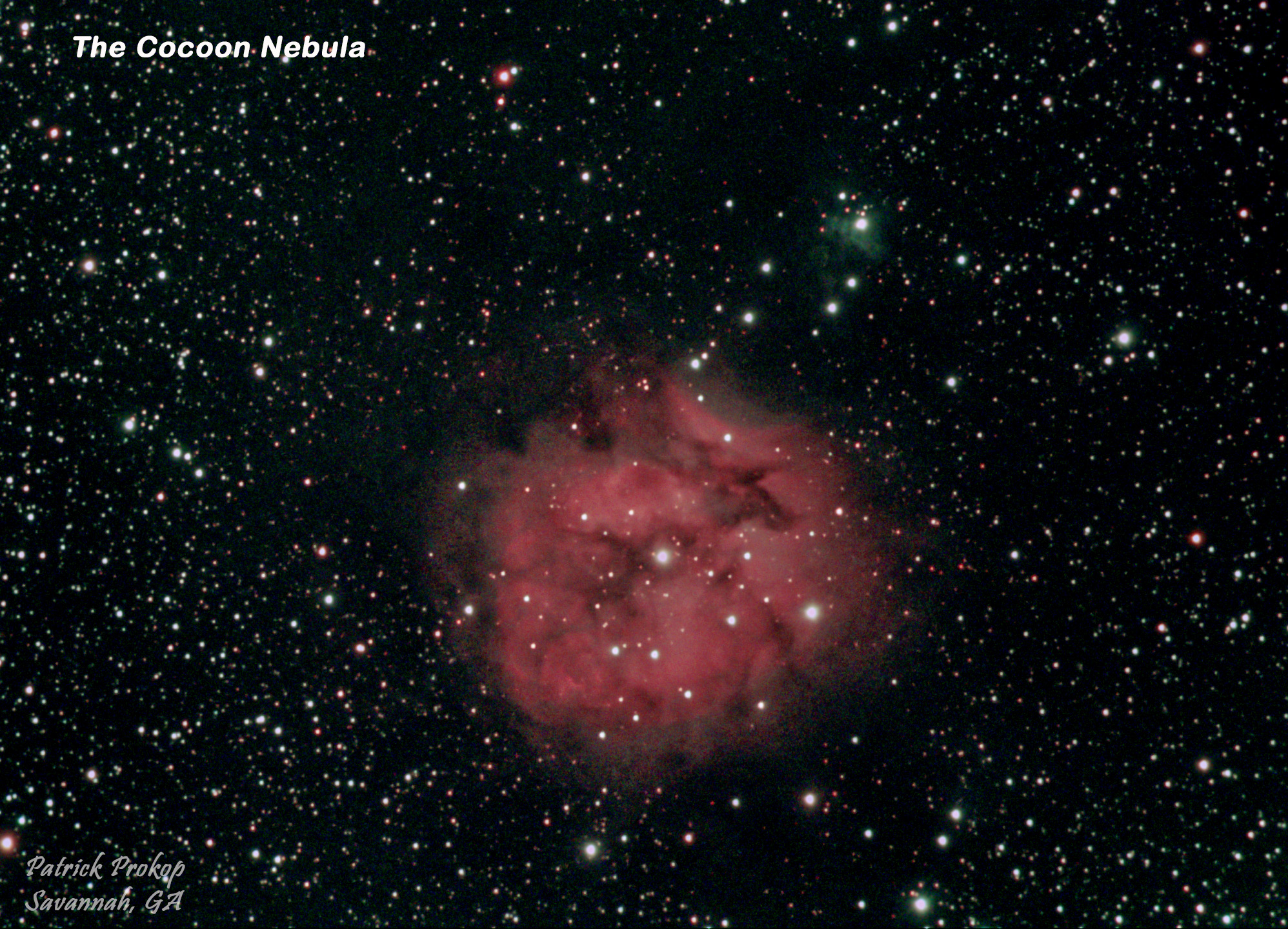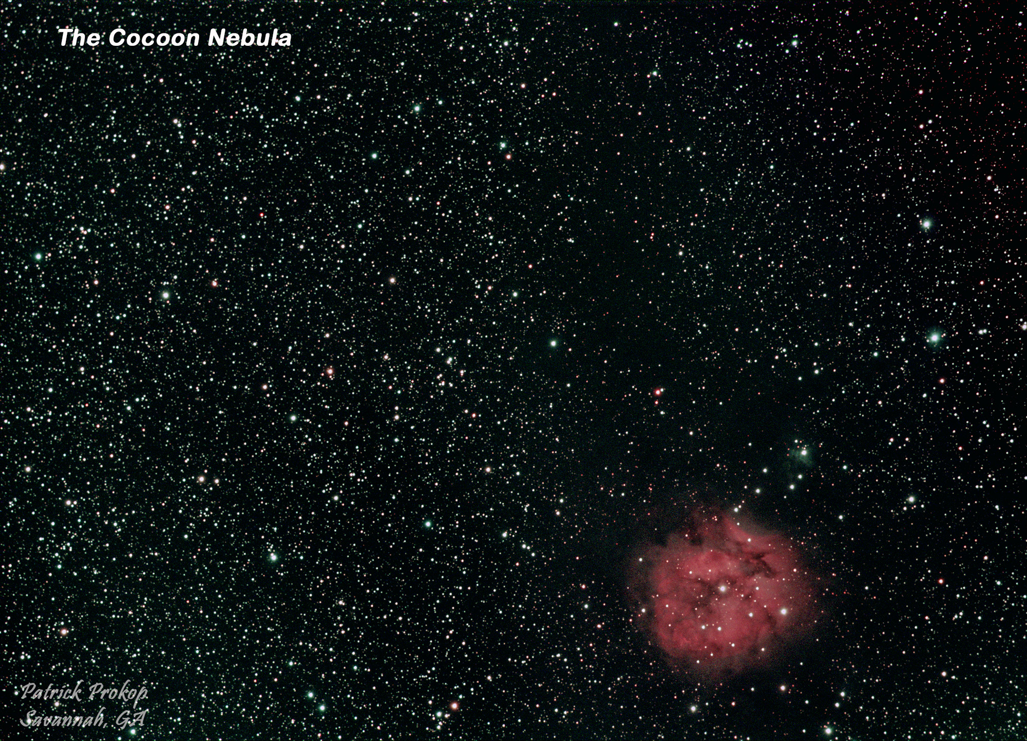 The Cocoon Nebula (also labeled as IC 5146, Caldwell 19, and Sh 2-125) is a reflection/emission nebula in the constellation Cygnus. The cluster is about 4,000 light-years away, and the central star that lights it formed about 100,000 years ago and is a stellar nursery where star-formation is ongoing.